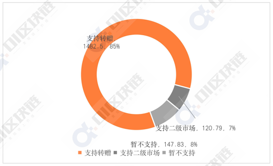 据01区块链、Forechain统计数据显示,在流通方式上,85%的数字藏品具有转赠功能,支持二级市场的约有120.79万件,占比7%,没有二级市场且不支持转赠的约有147.83万件,占比8%。值得关注的是,在1274万件透露出转赠功能具体要求的数字藏品中,约72.75%需要持满180天后才能转赠。另外有303.62万件数字藏品支持持有1-30天后转增,占比约为23.82%。