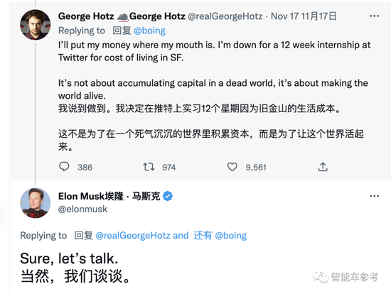 与此同时,上周霍兹宣布加入推特,打算在这实习12周,马斯克热情答应了。