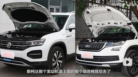 所以,中国消费者对于斯柯达还有个认识就是,你确实比大众便宜,但你配置也不如人啊。比如下面这两款同平台的SUV,大众途观L和斯柯达柯迪亚克,柯迪亚克机盖的隔音棉就被拿掉了。