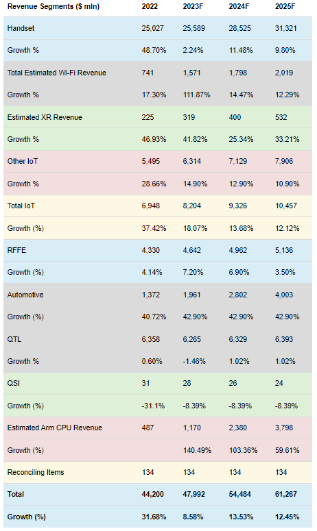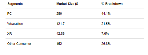 我们估计高通的XR收入是其物联网部门的一部分,该部门是消费者部门的一部分,占其物联网部门总收入的40%左右。然后,我们根据 2021 年的市场规模估计了该细分市场分为4类,即PC、可穿戴设备、XR和其他消费电子产品。对于其他消费电子产品,我们从消费电子产品总收入中减去PC和智能手机市场规模,如下表所示。