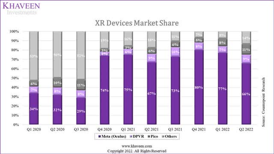 根据上面的 XR 设备市场份额图表,Meta在2022年第二季度以66%的份额主导市场。紧随其后的是笔克,其份额由2020年第一季的6%和DPVR的9%增加。
