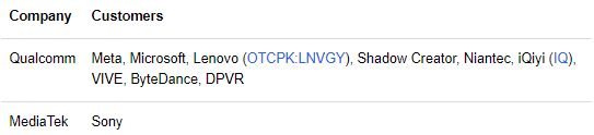 因此,我们认为这突显了高通在VR和AR芯片组市场的强势地位,因为它拥有比联发科更多的客户,其客户主导着XR市场,包括Meta,DVPR和Pico,合计份额为86%。