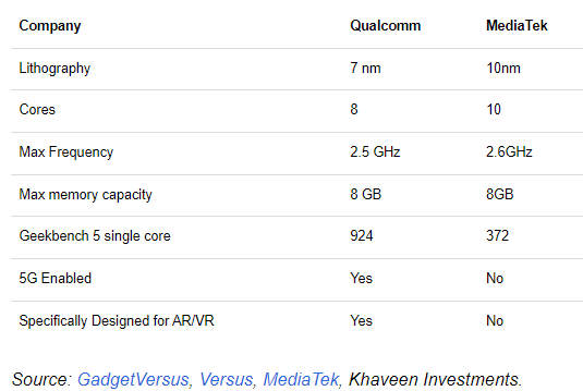 总体而言,我们认为这突显了高通相对于联发科的竞争优势,因为它在基于上表的 7 项标准中有 5 项超过了联发科。