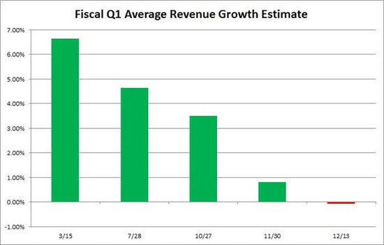 不幸的是,我们本周遇到了一个关键点,如下图所示,市场平均数据显示,苹果在12月当季的收入将同比下降。大约9个月前,市场预计这一时期的增长将超过6.6%,按美元计算,增幅将超过82亿美元。