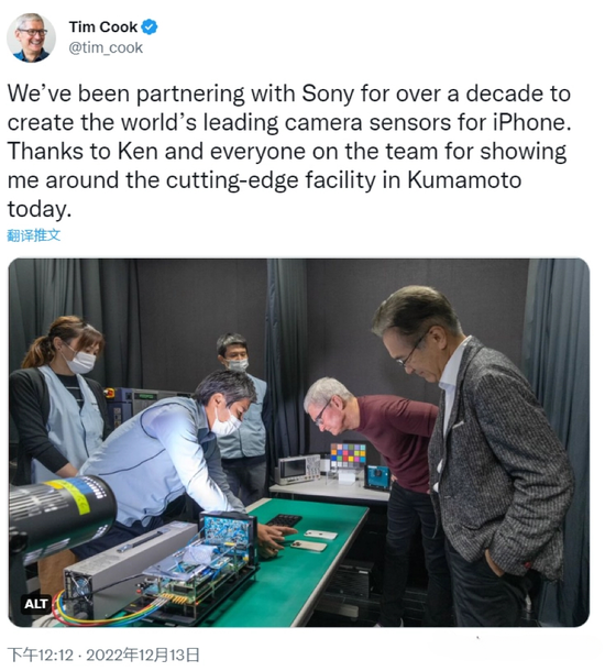 库克在Twitter上公布的行程显示,他去到了日本西南部的熊本县,参观了索尼集团。由索尼集团公司董事长、总裁兼首席执行官吉田健一郎接待,领着库克一行人参观索尼的图像传感器制造基地,以及索尼半导体解决方案熊本技术中心。