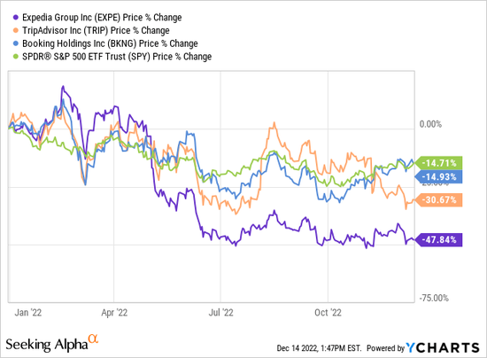 我们看好Booking Holdings在更广泛的在线旅游预订行业中的地位,在美国在线酒店预订行业中占有38.2%的市场份额,占该公司2022年第三季度总收入的91.6%。年初至今,预订量下降了近15%。