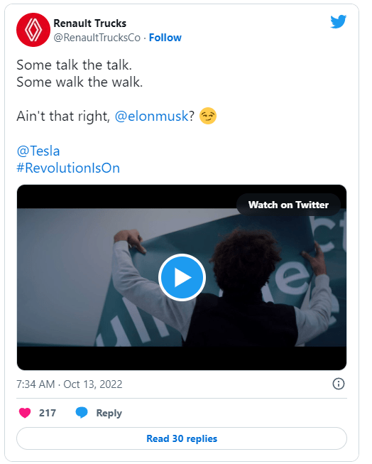 雷诺(OTCPK:RNSDF, OTCPK:RNLSY)最近嘲讽了特斯拉,因为它在特斯拉承诺向百事可乐提供卡车之前将其电动车送入市场。特斯拉已宣布计划在2022年生产200辆半挂车,2024年生产多达5万辆。该公司的半挂车最近确实完成了500英里的行驶,装载了81000磅的货物。