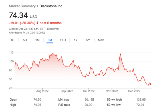 值得注意的是,这已经是黑石连续三个季度的滑铁卢,今年前两个季度,黑石也都出现了亏损。在业绩不佳和赎回风波的影响下,黑石的近几个月来股价也持续下跌,一度下跌超20%。