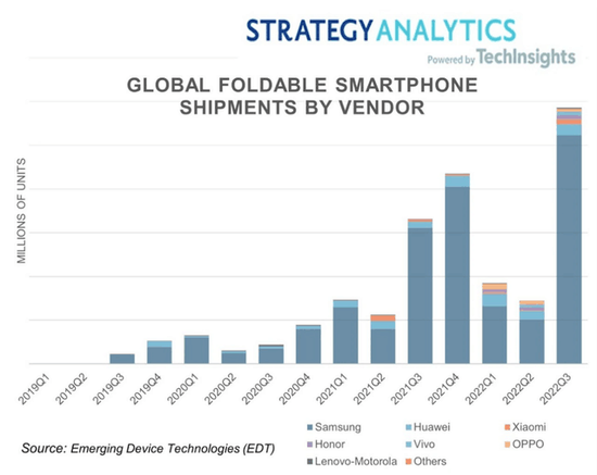 2022年,折叠屏手机的销售呈现井喷式增长。Strategy Analytics 数据显示,2022 年第三季度,全球折叠屏智能手机出货量大幅攀升,再次创下历史新高。同时,中国折叠屏手机产品单季出货量超过100 万部,同比增长246%,增速远超大盘,还创下了有史以来最大的单季出货量。