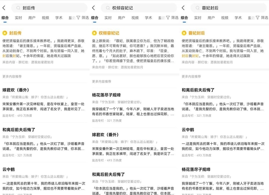 打开知乎搜索“封后传”,显示相关的小说名为《醉红妆:愿我如星君如月》。评论区中,不少网友纷纷表达“这才是盐选会员该看的小说”、“作者加油,我好爱这种小说”,另一些网友则表示,自己是在快手/抖音/视频号等视频平台看到这篇小说的,当时博主提供的名字各有不同,有时叫《权倾蓉妃传》,有时叫《封后传》,还有时叫《蓉妃她权倾朝野》。