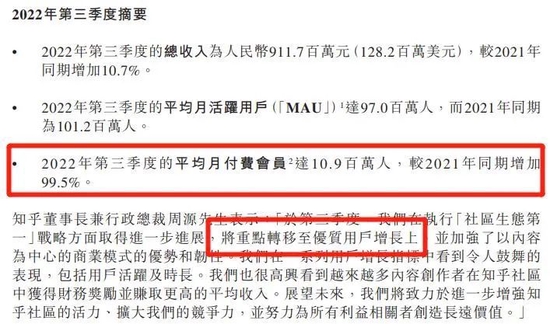 据知乎2022年第三季度财报显示,月付费用户达到1090万人,同比增长99.5%,第二季度月付费用户数也达到了850万人。作为CEO的周源也在两个季度的财报中提到,目前知乎将专注于“可持续及高效的方式保持优质用户增长”。