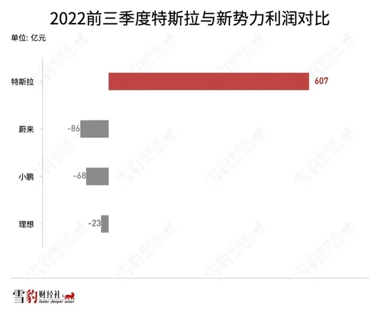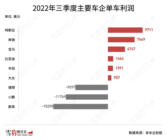 据测算,2022年三季度,特斯拉每卖出一辆车,净赚约9711美元(约合人民币6.8万元),是丰田(9500元)和2022年全球新能源车销冠比亚迪(10000元)的近7倍,而蔚小理都还在亏本卖车。