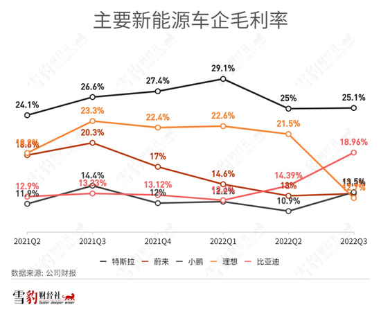 2022年前三季度,特斯拉的毛利率约为25%~30%,而多数传统车企、新势力车企的毛利率普遍为10%~20%。