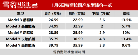 1月6日,特斯拉官网宣布,主力车型Model 3和Model Y降价2万~4.8万元。其中,Model 3后驱版从26.59万元降至22.99万元,降幅3.6万元;Model Y长续航版由35.79万元降至30.99万元,降幅4.8万元。