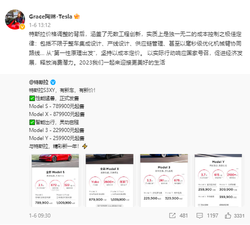事实上,尽管已经多番降价,但对特斯拉来说,其利润空间仍有保障。在宣布降价后,特斯拉对外事务副总裁陶琳便在社交平台对外表示,特斯拉整车集成设计、产线设计、供应链管理、甚至以毫秒级优化机械臂协同路线等因素,都是特斯拉能够不断降价的底气。