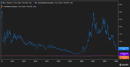 回顾10年前,通用汽车和福特的股价基本保持不变,以过去12个月(TTM)为基准,两家公司的市销比都在0.3倍左右。我们认为,这意味着投资者一直认为通用汽车和福特的收益是稳定的,而且是相对稳定的。