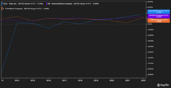 关于特斯拉(Tesla)的利润率已经有了很多报道,看多和看空的人再一次把茶叶解读为完全不同的两件事。在过去两年左右的时间里,特斯拉的EBITDA利润率才超过了通用汽车和福特,特斯拉到2022年底的EBITDA利润率将达到17.5%,通用汽车和福特的财年利润率将分别达到13.3%和11.9%。