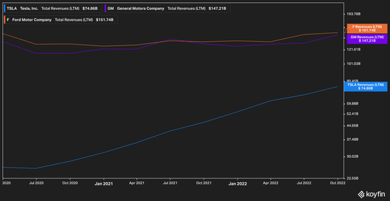 我们将从收入的基本回顾开始,因为销售是任何业务的基石。特斯拉的LTM收入约为740亿美元,而通用汽车为1470亿美元,福特为1510亿美元。