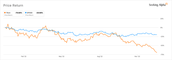 特斯拉在2022年的回报率约为-70%,而标准普尔500指数(SP500)的跌幅接近-20%。今天,该股的交易价格在113美元左右,在互联网上的留言板上,人们要么是欢欣鼓舞,要么是垂头丧气。