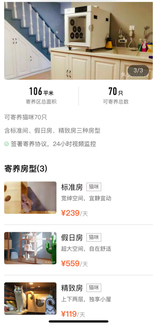在他看来,寄养有许多风险,比如换了环境,猫可能不适应,严重的话会产生应激反应。再比如,如果是寄养的话,他还会担心他的猫是否会跟其他猫打架,别的猫是否有传染疾病,店家能否按照自己的要求照顾猫、能否每天陪猫玩一会,如何保证环境卫生、干净等等。
