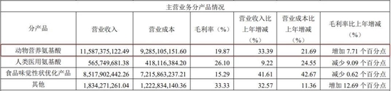 根据2021年财报显示,动物营养氨基酸(赖、苏氨酸为主)是梅花生物目前最核心的产品,贡献了50.74%的收入和52.14%的利润,毛利率为19.87%,其次才是食品味觉性状优化产品(味精、呈味核苷酸二钠为主)。