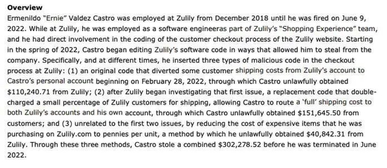 (1)他编写一段软件代码,将一小部分 Zulily 客户交易账目中的运费转移到了由 Castro 控制的 Stripe.com 账户——涉及的盗窃金额共 11 万 240.71 美元;
