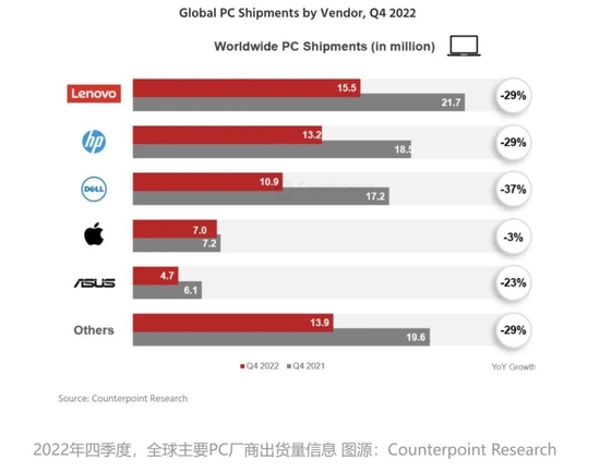 以全球前三位PC运营商联想、惠普、戴尔在2022年第四季度的表现来看,全球PC出货量暴跌就不难理解,2022年第四季度,联想、惠普的出货量均下滑了29%,而戴尔的出货量下滑更为惊人,达到了37%。排名前五的厂商中只有苹果的出货量跌幅为个位数,跌幅为3%,其余厂家最低跌幅为23%,其他品牌的跌幅也近30%。
