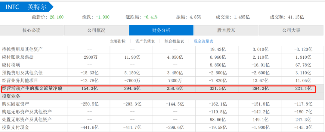 在2022年业绩表现不佳,高层震荡的情况下,英特尔还是支付了60亿美元的股息。要知道英特尔在2022年全年的净利润不过80.14亿美元,赚钱能力下滑,支付如此庞大金额的股息,直接导致英特尔现金流的下滑。财报显示,报告期内的经营产生的现金流净额为154.3亿美元,而2021年为294.6亿美元,同比下降了140.3亿美元。在第四季度业绩承压的情况下,有机构质疑英特尔此时支付高额股息是否合理,甚至有分析师认为英特尔应该消减股息。