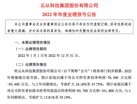 云从在1月30日发布了2022年业绩预告,公告显示其在2022年预计出现净亏损7.85亿元至9.34亿元,与上年同期相比,亏损将扩大24.18%至47.75%。