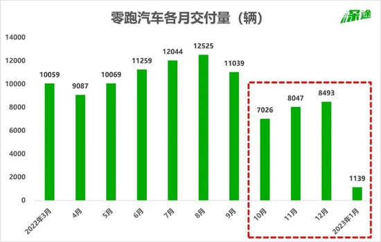 比较让人意外的是零跑。1月只交付了1139辆,而去年12月是8493辆,环比下跌幅度达到87%。零跑现在是明显的后劲不足,去年有连续5个月交付过万,从10月开始掉到七八千的水平。1月的成绩用“扑街”来形容再合适不过了。