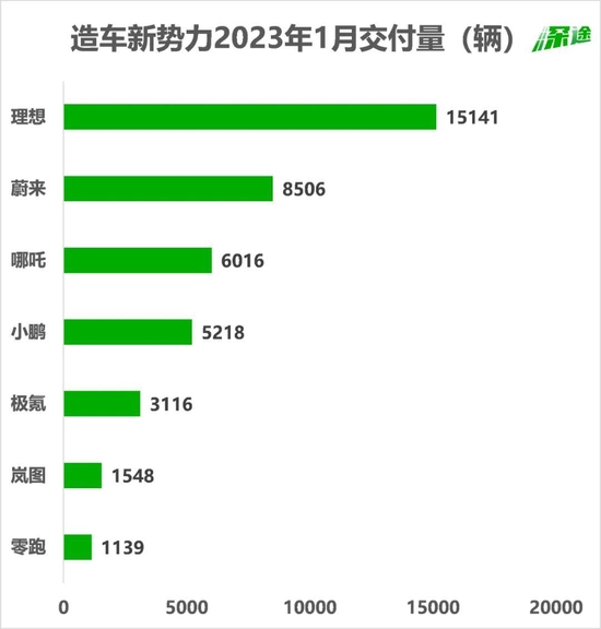 总体来说,1月的成绩不算好。除了理想交付了15141辆,其他各家都没过万,零跑更是只交付了1139辆。1月的交付量排名如下图: