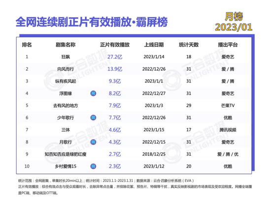 然而,《三体》的火热开播有目共睹,它的高开低走也是众所周知。云合数据显示,2023年1月,全网连续剧正片有效播放量中,《狂飙》以27.2亿稳居第一,而《三体》则为4.6亿,甚至不足《狂飙》的六分之一。