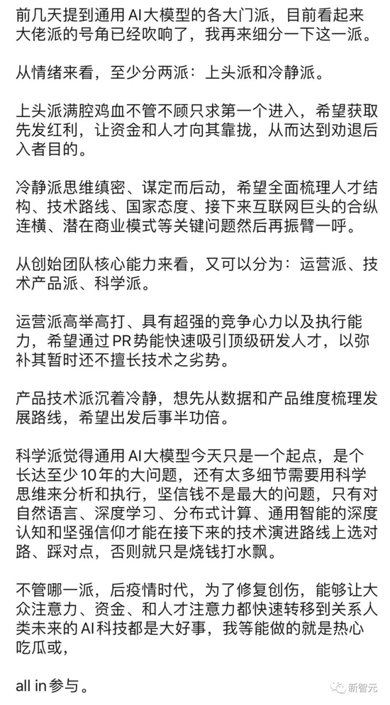 前几天,李志飞曾在朋友圈发出第一期评论,把现在入局的各方势力分为巨头派、大佬派、海归/大厂高管派、小创业公司转型派、教授派、打酱油派等。