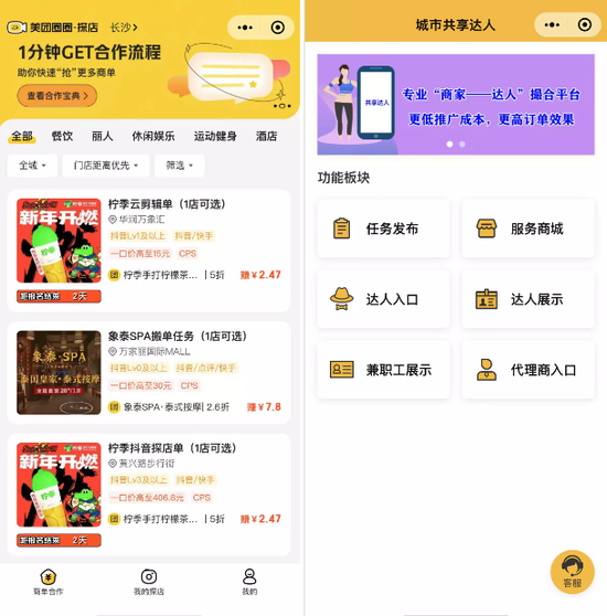 不久后,一款名为美团圈圈探店的微信小程序上线,大众点评、抖音、快手、小红书和微博的达人,都可以在后台进行无门槛认证。达人认证成功后,便可以在平台上领取商单任务,在各短视频平台上发布探店视频,从而获取收益。