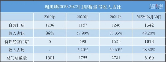 但从2022年财报看,虽然特许经营门店的数量已经超过自营门店,但半数的收入仍然集中在自营门店手中,快速开店并未带来营收的回报,还压缩了利润空间,周黑鸭特许经营商的整体运营效率还有待提高。