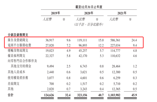 亏损多半可以归结为高企的营销费用。招股书显示,2019年至2021年,蕉下分销和销售费用分别为1.25亿元、3.23亿元、11.04亿元,占营收为32.45%、40.7%和45.9%,其中广告及营销的开支分别为0.369亿元、1.19亿元、5.8636亿元,占比为9.6%、15%、24.4%。