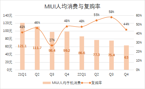 从过去8个季度可以看到,小米复购率整体呈上升趋势,但是MIUI人均手机消费持续走低,截至去年第四季度,MIUI人均消费仅为63元,大致相当于爱奇艺连续包三个月会员的价格。