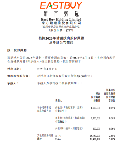 4月11日晚,东方甄选突发公告,向公司包括高管、雇员在内的154人发放3045.9万股股份奖励,按照东方甄选当天收盘价29港元计算,本次股份奖励总价值约8.83亿港元。