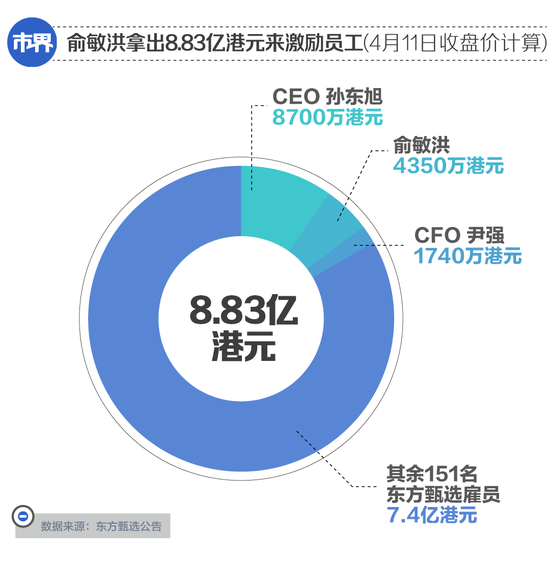其中,俞敏洪获得150万股,CFO尹强获得60万股,按照4月11日收盘价计算,价值分别约4350万港元、1740万港元。CEO孙东旭则获得300万股,价值高达8700万港元。