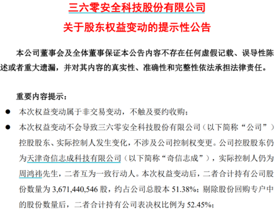 4月4日晚间,周鸿祎实控的三六零(SH:601360)发布公告称,周鸿祎与前妻胡欢经友好协商,已办理离婚手续,并就股份分割等事宜作出相关安排。根据《离婚协议书》,周鸿祎拟通过非交易过户的方式将其直接持有的三六零股份4.47亿股转让至胡欢名下。股份转让后,三六零股份实控人仍为周鸿祎,直接或间接共计持有51.38%股份,表决权比例为52.45%。