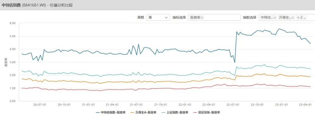 另一方面,“中特估”指数的股息率(一年总派息额与当时市价的比例),也稳定在4~5之间,远高于上证指数、深证指数等A股几个重要指标。就连上交所总经理蔡建春都在前不久为央国企打抱不平,“与5年前相比,国有上市公司利润增长70%,但市值仅增长10%,总市值占比下降9个百分点”。