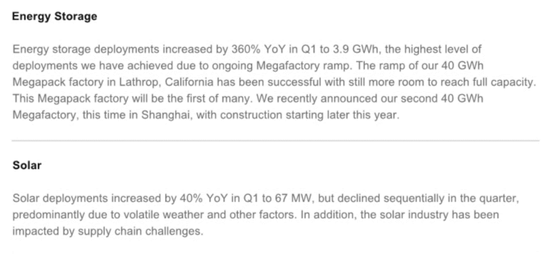 财报中罗列了一系列利好消息,例如储能部署在第一季度同比增长360%、今年晚些时候将在上海建立第二个40千瓦时的超级工厂、以及同比增长的太阳能部署(但也会受到供应链挑战的影响)等,总体看来似乎都在向好的方向发展,但总让人觉得有些尚未落地与遥不可及。