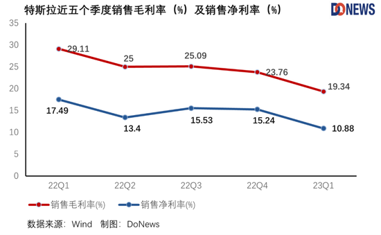 毛利率则进一步从去年四季度的23.8%下降至19.3%,跌破20%的关键节点。从营收、利润、毛利率的环比下滑来看,特斯拉去年底掀起的价格战正是“罪魁祸首”。