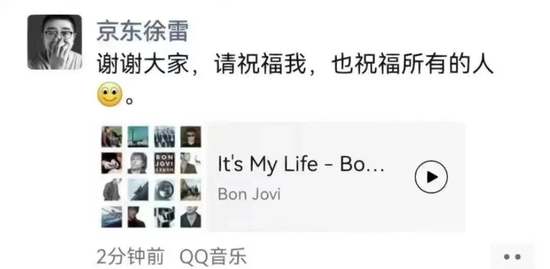 并配了一首美国摇滚乐队Bon Jovi的《It‘s My Life》,正式宣告自己作为京东核心实权层职业生涯划上句号。