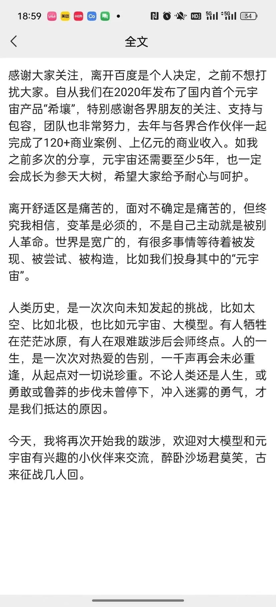在马杰朋友圈发布的告别长文中,他声称离开百度是“个人决定”,同时也表示,“元宇宙还需要至少五年,也一定会成长为参天大树,希望大家给予耐心和呵护。”