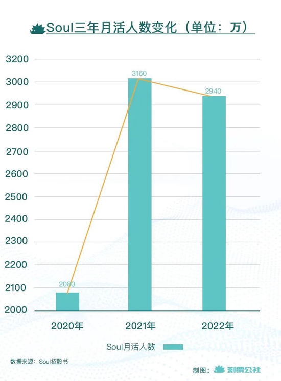 但令人担忧的是,Soul的月活跃用户不升反降。与2021年比降了7.3%。