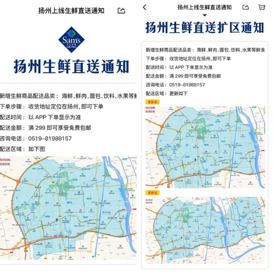 图/山姆开通扬州部分地区的生鲜直送通知