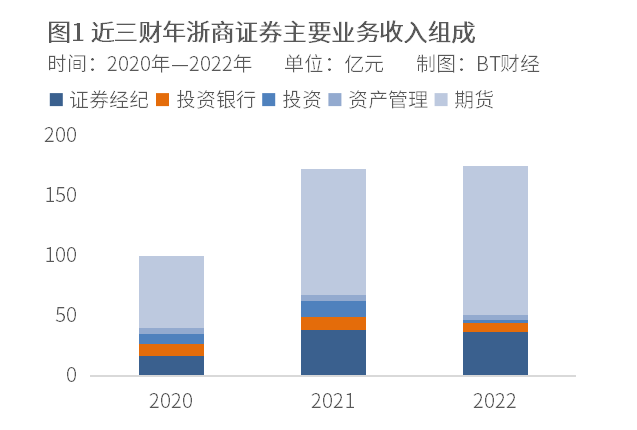 BT财经整理了过去三个财年浙商证券的主营业务收入构成,可以明显看到,证券经纪和期货业务构成了公司收入最主要的部分,其中证券经纪业务收入2022年出现下滑,投资银行、投资和资产管理业务也缩水,好在有体量非常大的期货业务增长,顶住了营收。