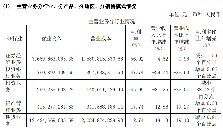 具体分业务板块来看,2022年呈现“四降一升”的现象——证券经纪业务实现收入36.70亿元,同比下降4.62%;投资银行业务实现收入7.61亿元,同比下降29.74%;投资业务实现收入2.59亿元,同比下降81.25%;资产管理业务实现收入4.15亿元,同比下降12.86%;期货业务实现收入124.25亿元,同比增加18.13%。