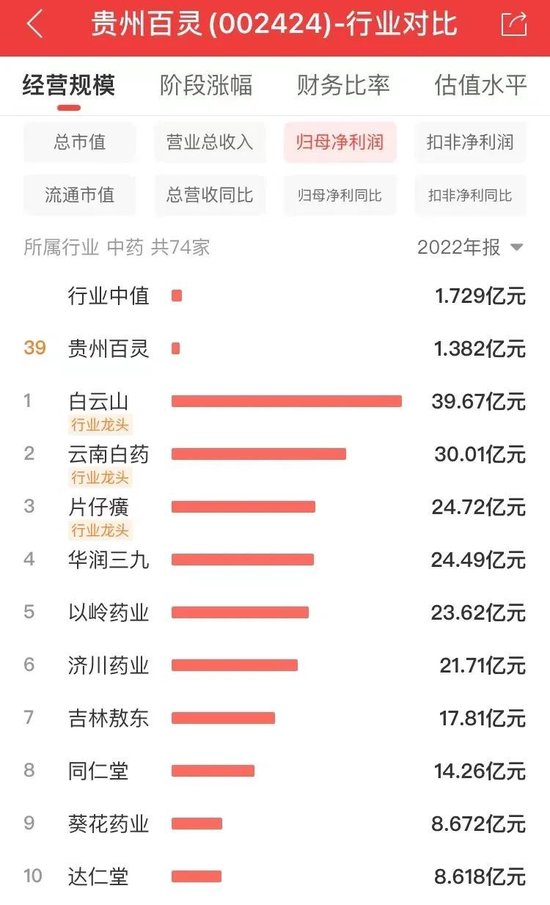 再以2022年业绩为例,74家中药上市公司中,贵州百灵的年度归母净利润为例第39位。